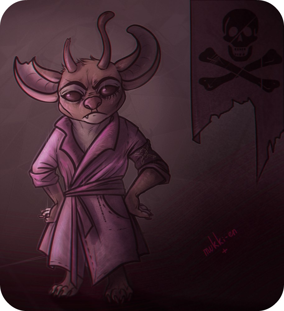 Маленькая бежевая бестия. В буквальном смысле. Из-за своего роста Аделаида редко кому достаёт даже до колен. Что её неимоверно бесит. Нередко в больших, с отсутствующим зрачком, глазах карлицы можно уловить лютую ненависть по отношению ко всем "дылдам". Если девушку побрить, то под шерстью обнаружится просто неисчислимое количество шрамов. Аделаиде не раз и не два приходилось штопать саму себя. Самым ярким напоминанием о собственном безрассудстве для девушки являются бугрящиеся рубцы на том месте, где должны быть пальцы. Оборванный "ус" на голове так же говорит о том, что жизнь карлицы нельзя назвать безопасной. Большие уши - гордость и символ статуса каждого опау - пострадали не меньше остального тела. Впрочем, Аделаиду совсем не тревожит то, сколько ран она получила. И получит в дальнейшем. Дыру в мясе можно стянуть суровой ниткой, а вместо отсутствующей конечности - поставить грубый протез.В одежде девушка сделала исключительный выбор. Чаще всего Аделаиду можно увидеть в розовом халате. Не менее изношенном, чем сама карлица. Выцветшем. С огромным количеством заплаток. Когда-то очень давно, наткнувшись на изорванный в лоскуты флаг, девушка присвоила намалёванный на нём символ - Весёлого Роджера - себе. Эта повязка с черепом и костями всегда красуется на её руке. Глубоко в душе гордится своим стилем, ведь для многих он уже стал узнаваемым.